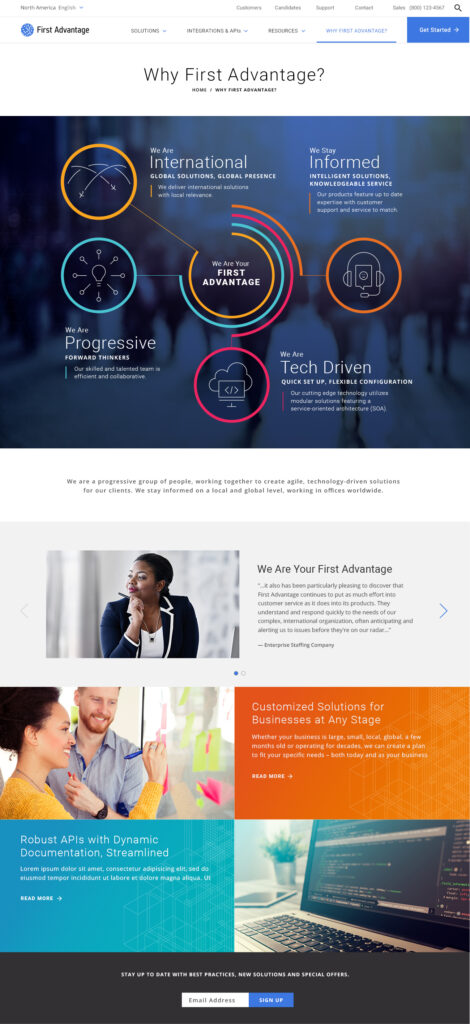 First Advantage, provide comprehensive background screening solutions that provide employers and housing providers straightforward, actionable reports so they can make confident choices, reduce risk, and stay compliant. They required a new and improve global website and CMS Platform and an advance search engine results.